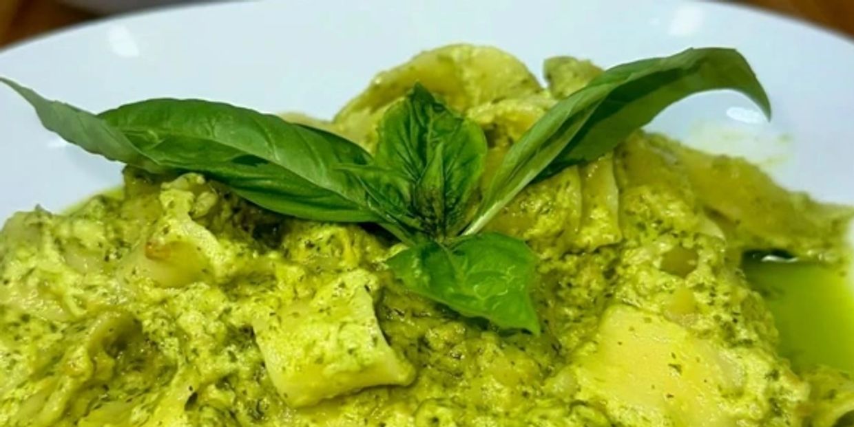 6. Luego añades 2 cucharadas de la salsa pesto hasta que se integren. Es momento de añadir la pasta cocina y mezclarlo con la salsa. Aquí tienes la salsa creamy pesto.